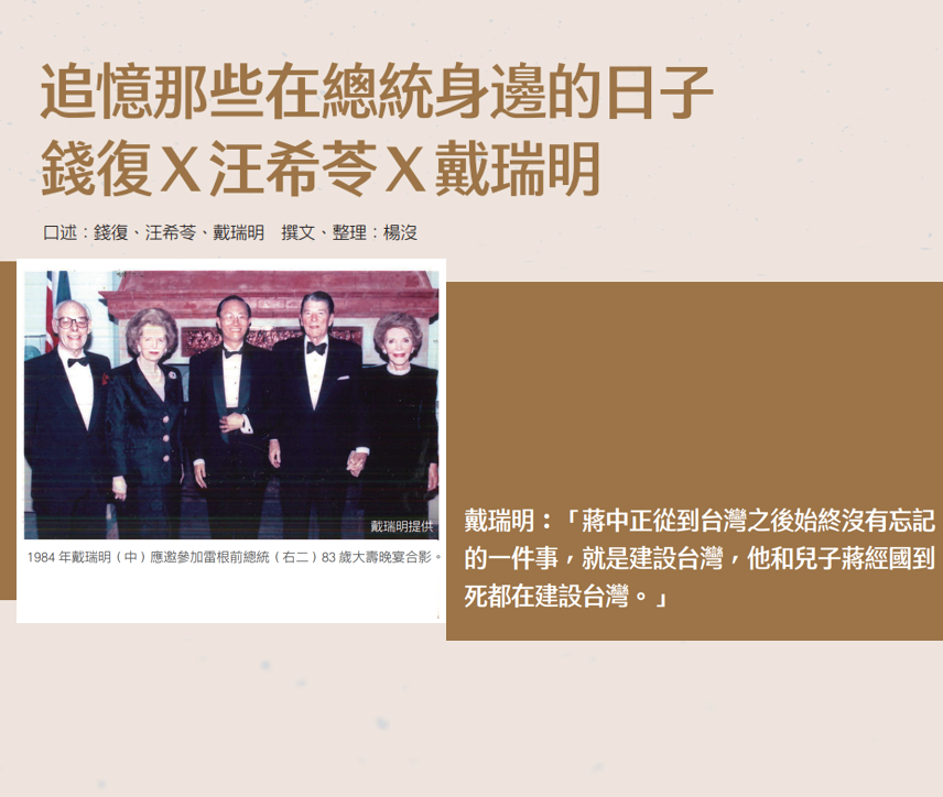 「剛到台灣的第一時間,蔣總統就是要反攻大陸,1958年杜勒斯(美國國務卿)來看他之後,他調整成七分政治三分軍事,先建設台灣,再光復大陸。後來鄧小平的改革開放,就是受到台灣經濟奇蹟的影響。」