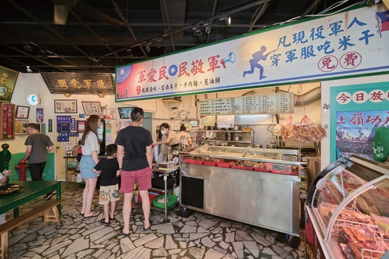 除了美食之外,讓眷村口與眾不同的還有牆面與櫥窗間的老物。台灣光復後政府發給民眾懸掛的第一面國旗、陸海空軍服、眷補證、帶拉門的老電視、紀念酒,以及早年聯勤發糧用的油杯、軍用鹽和配給香菸,加上各式軍用品、舊照片、證件、徽章等,就像間博物館。