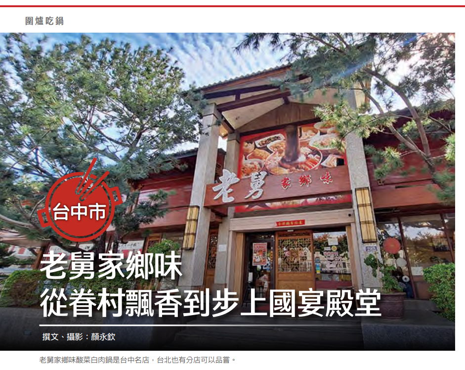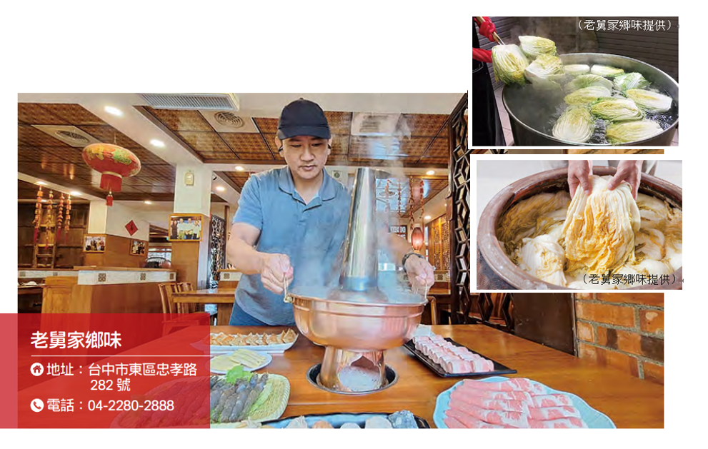 在台中飄香 19 年的老舅家鄉味,以獨沽一味的正宗東北酸菜白肉鍋,在競爭激烈的台中美食業界中屹立不搖,家傳古法醃漬、自然發酵而成的酸白菜,湯頭自然酸香,愈煮愈甘甜,酸白菜清爽甘脆,搭配新鮮肉類、海鮮食材涮煮,愈吃愈唰嘴,再點幾份東北麵食點心,一頓美味的家鄉料理讓人回味無窮,無怪乎李安在台灣拍片期間就上門 20 多次,百吃不膩。