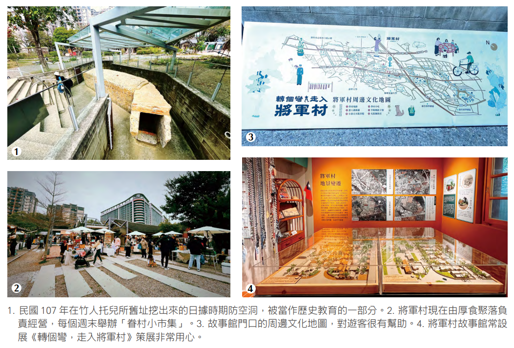 金城新村原址保留的建築,在爭議中化身成了「將軍村開放圖書資訊園區」,從前的竹人幼稚園與診療所,如今是食物森林教育環境基地,對面保留的楊書田等將校的家則化身餐酒館、咖啡屋與燒肉店,夜幕降臨後,會逐漸熱鬧起來。